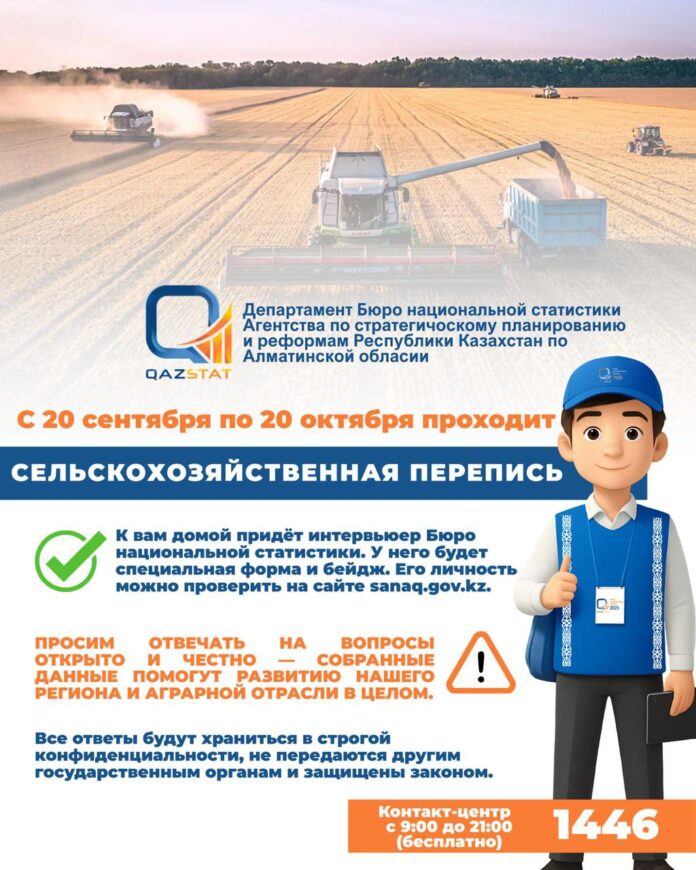 Онлайн-этап переписи завершится в 23:59 20 сентября, на этом этапе у сельхозформирований и домохозяйств была возможность пройти опрос на сайте sanaq.gov.kz. Тогда участие приняли свыше 44 тыс. респондентов по Алматинской области. Теперь начинается более масштабный этап: интервьюеры будут обходить дома и собирать данные с помощью планшетов. Призываем всех активно участвовать и предоставлять актуальную информацию. Вопросы простые и касаются только сельхоздеятельности. Все ответы используются исключительно в статистических целях и не передаются третьим лицам.