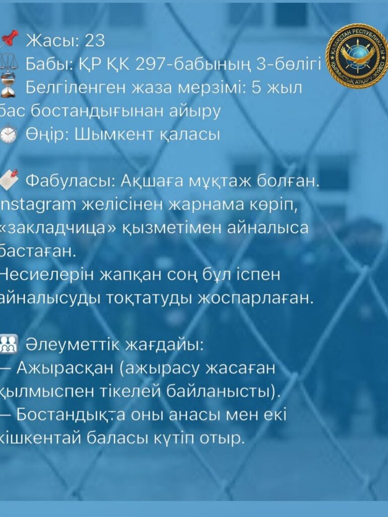 23 жастағы сотталған қыз өз қылмысының ойланбай жасалған қадамның салдары болғанын мойындады. Айтуынша, Telegram желісінен жеңіл табыс туралы жарнаманы көріп, оның салдарын түсінбестен келісім берген. Бастапқыда тек несиелерін жауып, бұл іспен тоқтаймын деп ойлаған. Алайда әр іс үшін жауап беру қажет.