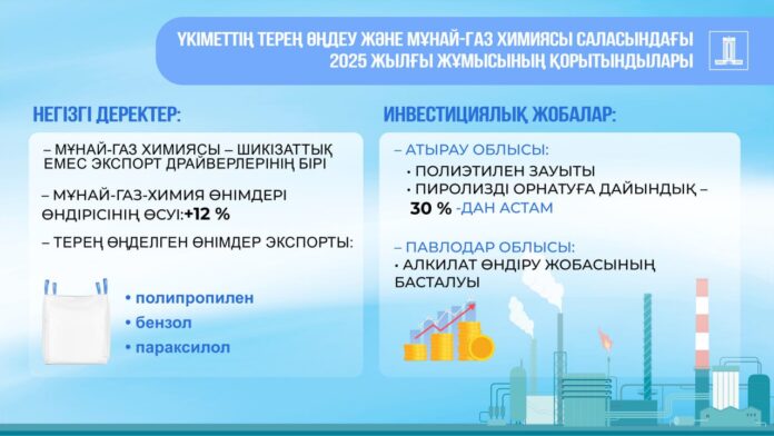 Қазақстан Республикасының энергетика министрі Ерлан Ақкенженовтің БАҚ өкілдерімен кездесуі аясында Үкіметтің 2025 жылғы терең өңдеу және мұнай-газ химиясы секторындағы жұмысының қорытындысы шығарылды.Мұнай-газ химиясы саласында экономиканың шикізатқа тәуелділігін әртараптандыруға және төмендетуге арналған дәйекті бағыт жүзеге асырылуда. Отандық мұнай-газ химиясы тұрақты екі таңбалы өсім қарқынын көрсетіп отыр және шикізат емес экспорттың негізгі драйверлерінің бірі ретінде қалыптасуда.«Мұнай-газ химиясындағы өнім өндірісінің көлемі 12%-ға өсті. Қазақстан терең өңделген полипропилен, бензол және параксилол сынды өнімдерді сыртқы нарықтарға жүйелі түрде жеткізуді бастады», — деп атап өтті Ерлан Ақкенженов.Саланың стратегиялық дамуы ауқымды құрылыс кезеңімен тығыз байланысты. Елімізде әлемдік деңгейдегі ерекше мұнай-химиялық кешендер салынып жатыр. Атырау облысында полиэтилен зауытының болашақ пиролиз қондырғысының құрылысы 30%-дан астамына орындалды. Павлодарда алкилат шығаратын кәсіпорынның құрылысы басталды.➖Исполнение поручений Президента по снижению сырьевой зависимости: объем производства нефтегазохимической продукции увеличился на 12%📌 В рамках встречи министра энергетики Республики Казахстан Ерлана Аккенженова с представителями СМИ подведены итоги работы Правительства в секторе глубокой переработки и нефтегазохимии за 2025 год.В нефтегазохимической отрасли реализуется последовательный курс на диверсификацию и снижение сырьевой зависимости экономики. Отечественная нефтегазохимия демонстрирует устойчивые двузначные темпы роста и формируется в качестве одного из ключевых драйверов несырьевого экспорта.«По итогам 2025 года объем производства нефтегазохимической продукции увеличился на 12%. Казахстан ведет системные поставки на внешние рынки продукции глубокого передела, включая полипропилен, бензол и параксилол», — подчеркнул Ерлан Аккенженов.Стратегическое развитие отрасли связано с этапом масштабного промышленного строительства. В стране реализуются проекты по созданию нефтехимических комплексов мирового уровня. В Атырауской области строительство установки пиролиза будущего завода полиэтилена выполнено более чем на 30%. В Павлодарской области начата реализация проекта по созданию предприятия по выпуску алкилата.📱 @KZgovernment