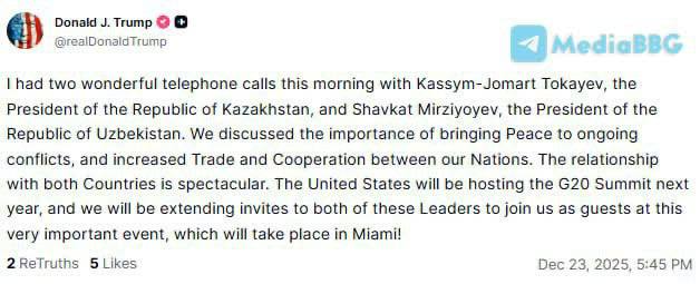 ⚡️«Сегодня утром у меня был замечательный телефонный разговор с Касым-Жомартом Токаевым, президентом Республики Казахстан.Мы обсудили важность установления мира в текущих конфликтах, а также расширение торговли и сотрудничества между нашими странами. Отношения с обеими странами впечатляющие. США будут принимать саммит G20 в следующем году, и мы пригласим лидера присоединиться к нам в качестве гостей на этом очень важном мероприятии, которое пройдет в Майами», — написал президент США.@kazinform_news