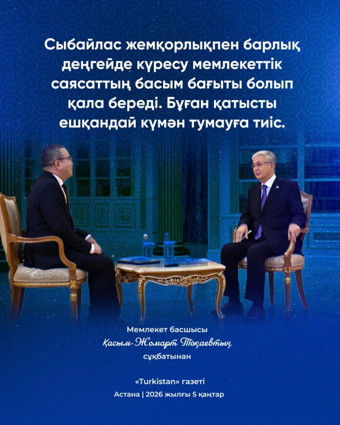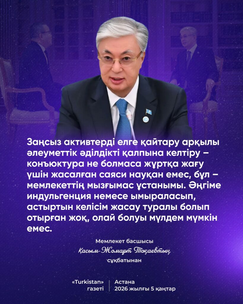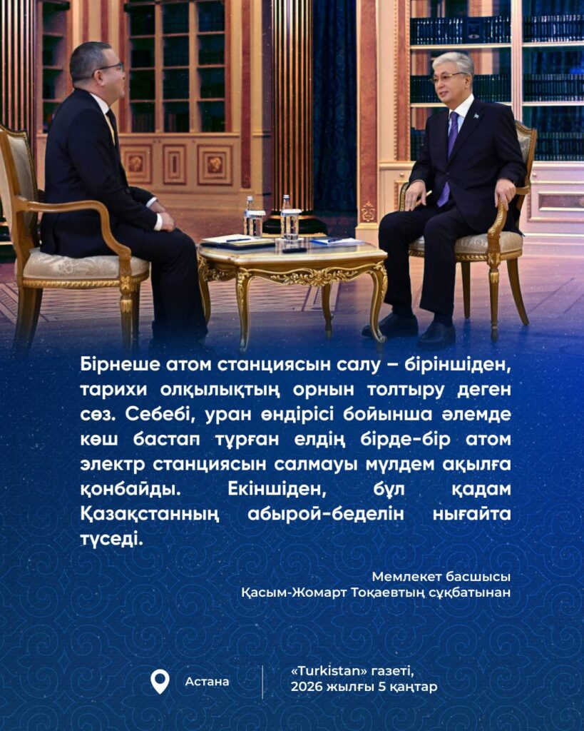 ДомойЖаңалықтар | НовостиМемлекет басшысы Қасым-Жомарт Тоқаевтың сұқбатынан 05.01.2026 Мемлекет басшысы Қасым-Жомарт Тоқаевтың сұқбатынан FacebookVKTelegramWhatsAppTwitterCopy URL FacebookVKTelegramWhatsAppTwitterCopy URL Предыдущая статья✍️ Президент 2025 жылы мәдениет саласындағы мемлекеттік стипендияны беру туралы өкімге қол қойдыСледующая статьяИз интервью Главы государства Касым-Жомарт Токаева Жаңалықтар Глава государства подписал Указ об объявлении 2026 года Годом цифровизации и искусственного интеллекта Мемлекет басшысы 2026 жылды Цифрландыру және жасанды интеллект жылы деп жариялау туралы Жарлыққа қол қойды Мемлекет басшысы Парламенттік реформа жөніндегі жұмыс кеңесін өткізді Глава государства провел рабочее совещание по Парламентской реформе Из интервью Главы государства Касым-Жомарт Токаева ✍️ Президент 2025 жылы мәдениет саласындағы мемлекеттік стипендияны беру туралы өкімге қол қойды