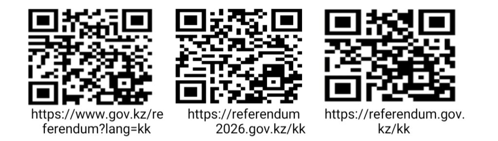 1. Egov mobile, екінші деңгейлі банктер (Kaspi Bank, Halyk Bank) және байланыс операторларының SMS-хабарламалары сияқты ресми дереккөздерден жіберілетін сілтемелер арқылы немесе төменде жарияланған QR-кодты сканерлеу арқылы азаматтар сайттың арнайы бөліміне өтіп, онда ЖСН енгізу арқылы өз референдум учаскесін анықтай алады.