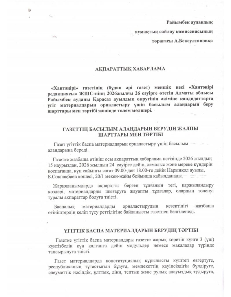 Домойhantengrigazeti.kz ақпаратАқпараттық хабарлама 30.03.2026 Ақпараттық хабарлама FacebookVKTelegramWhatsAppXCopy URL FacebookVKTelegramWhatsAppXCopy URL Предыдущая статьяАлматы облысында Іле-Алатау ұлттық паркінде «Бутакты» визит-орталығы ашылды Жаңалықтар Алматы облысында Іле-Алатау ұлттық паркінде «Бутакты» визит-орталығы ашылды 30 марта — Международный день без отходов 30 наурыз – Халықаралық қалдықсыз күнХалықаралық қалдықсыз күн аясында Қазақстан Республикасының Экология және табиғи ресурстар министрлігі Қазақстан Республикасында қалдықтарды тұрақты басқаруға көшу және қайта... Алматы облысы сауда және тұтынушылардың құқықтарын қорғау департаментіне жыл басынан 50 шағым түскен Қонаев қаласында кәріз тазарту жүйесінің құрылысы жүргізілуде Мемлекет басшысы Түркия Президенті Режеп Тайип Ердоғанмен телефон арқылы сөйлесті🇰🇿🇹🇷